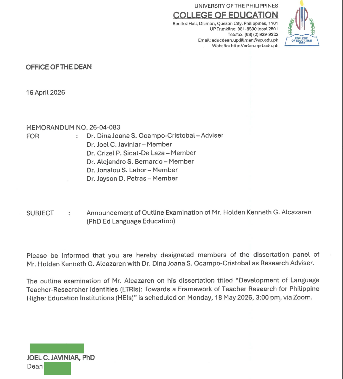 Announcement of Oral Examination of Mr. Holden Kenneth G. Alcazaren (PhD Ed Language Education)