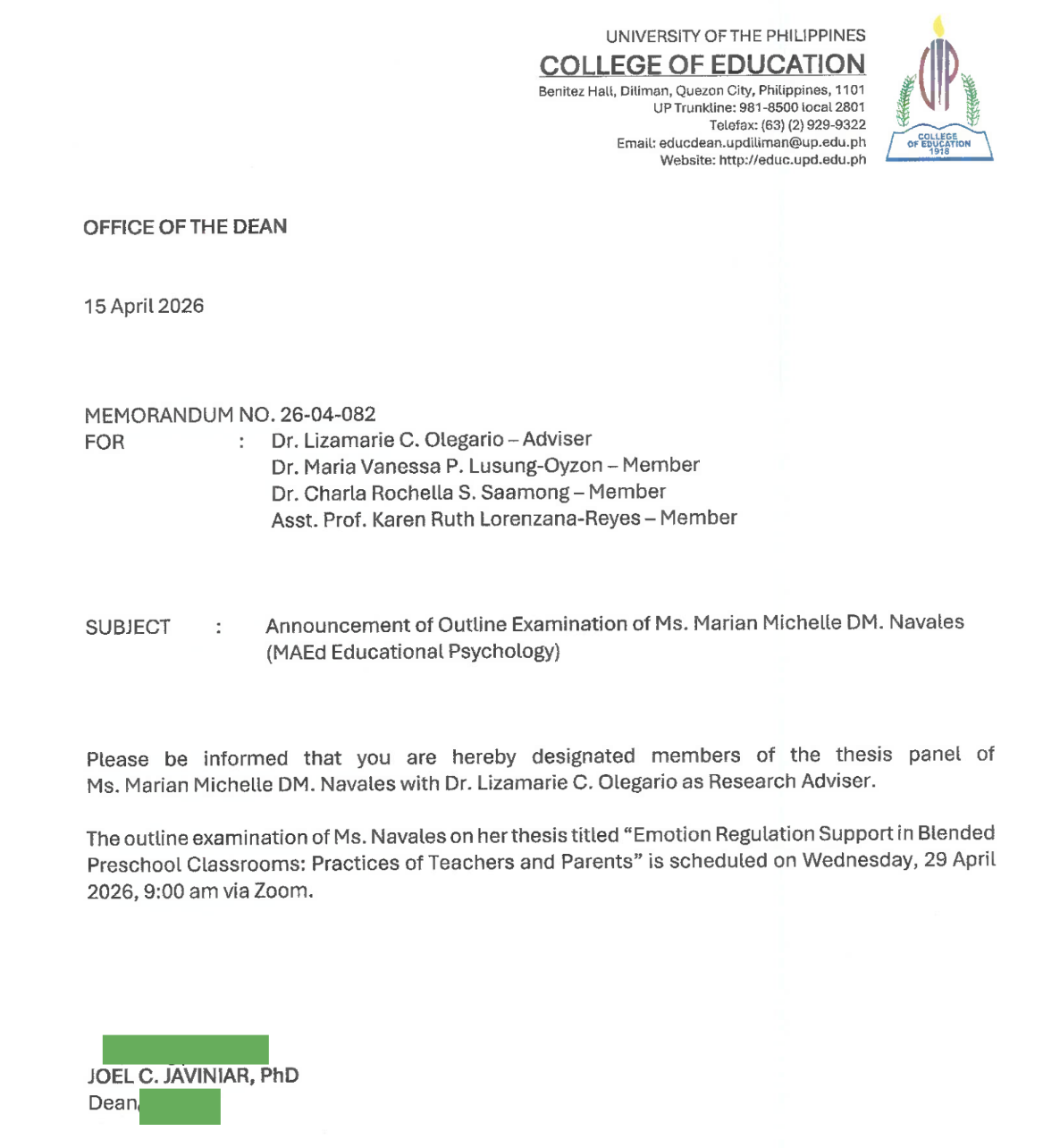 Announcement of Oral Examination of Ms. Marian Michelle DM Navales (MAEd Educational Psychology)