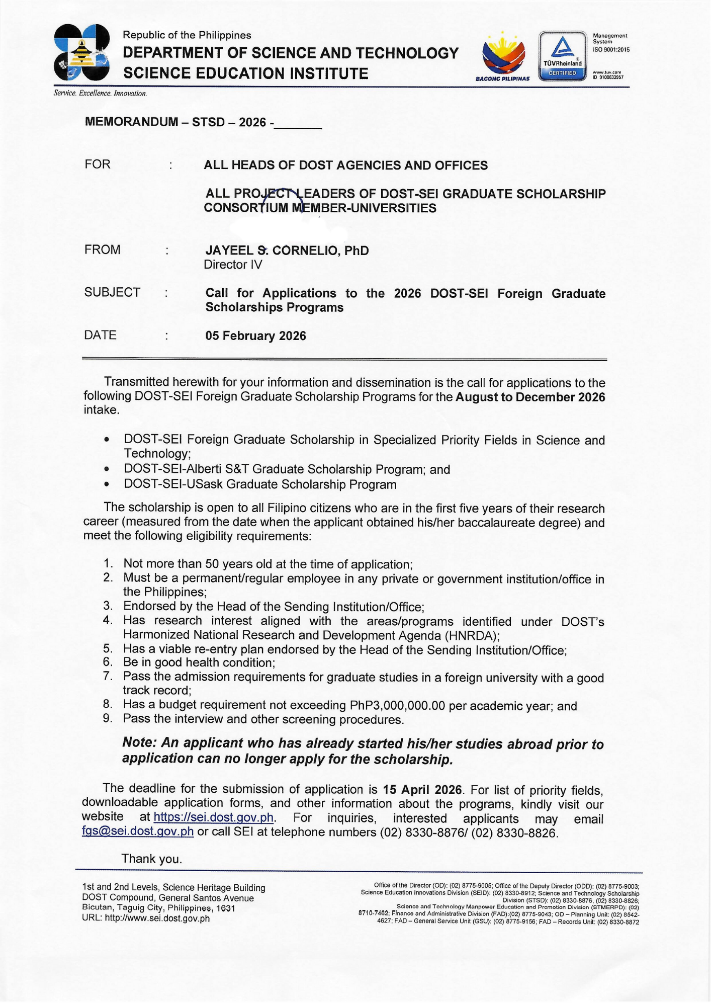 [Call for Applications] 2026 DOST SEI Foreign Graduate Scholarship Programs