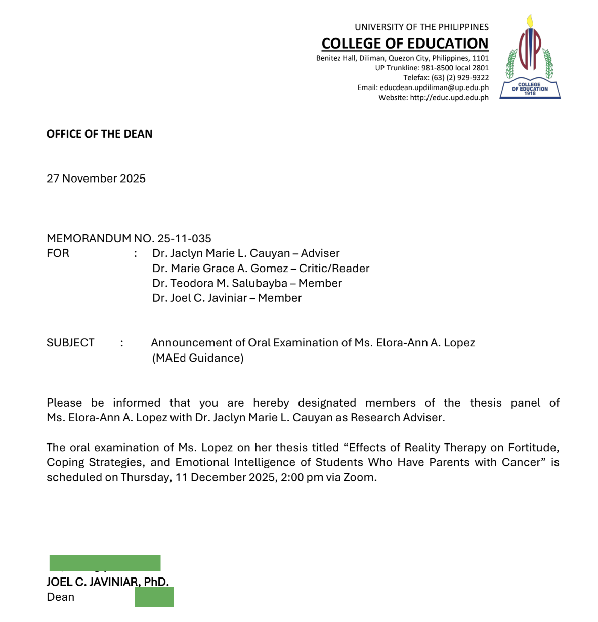 Announcement of Oral Examination of Ms. Elora-Ann A. Lopez (MAEd Guidance)
